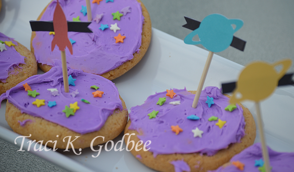 Essentially: I bought bakery sugar cookies and added the purple frosting/ sprinkles. I created some “cookie pics” by cutting the space themed shapes with my cricut and attaching to toothpicks.