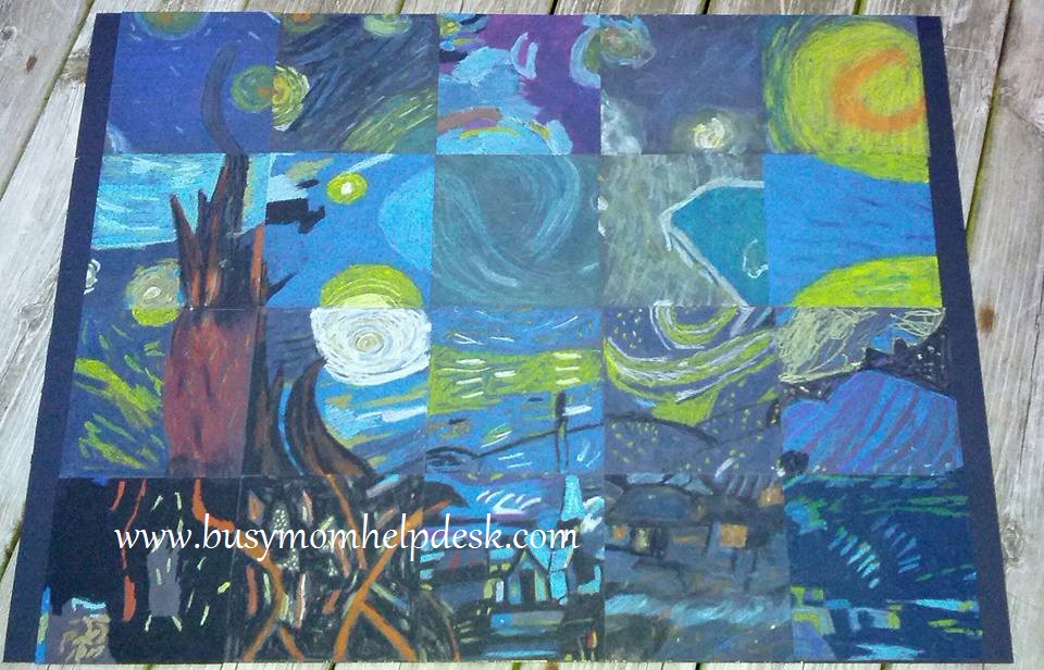 We had 17 students in the class- I trimmed 2 inches off the edges of the print in order to cut even pieces. At 6×6 squares I cut 20 pieces total. I created 3 of the sections myself to complete the photo.
