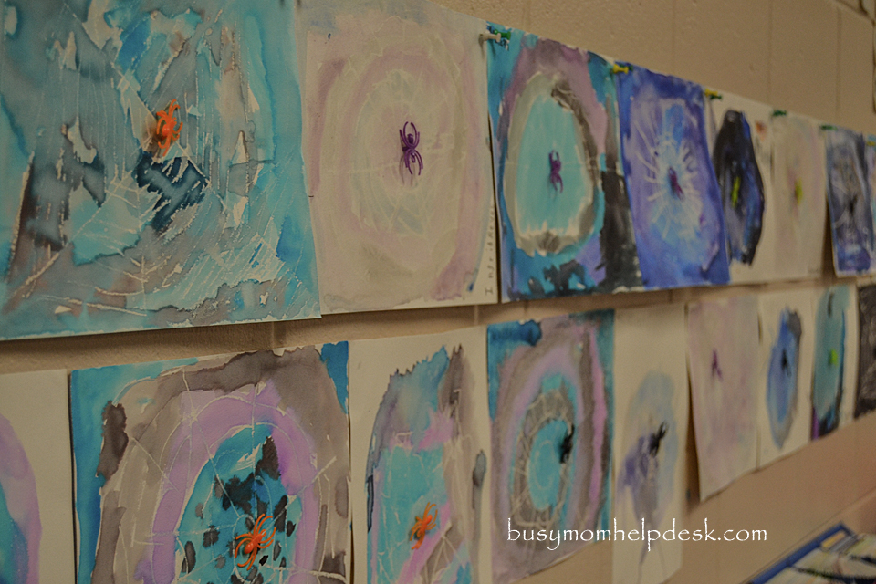 When I was working with first grade to design their October project, I found a link on pinterest to a fun crayon resist spiderweb project.