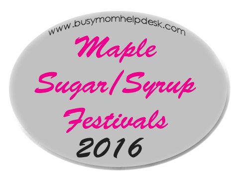 Vermontville, MI- last full weekend in April Kalamazoo, MI at Kalamazoo Nature Center March 12-13, 2016 Lansing, MI at Fenner Nature Center March 19, 2016 Shepherd, MI at the soccer field on the north end of town- April 21-23 Chelsea, MI Maple Sugar Festival: March 12, 2016 INDIANA: Brown County-National Maple Syrup Festival March 5-6, 2016 OHIO: Hueston Woods State Park Maple Syrup Festival March 5-6 and 11-12 Delaware, Ohio at Camp Lazarus March 7th and March 14 Northeast Ohio Family Fun has a compiled listing of multiple Maple syrup/sugar festivals here. MINNESOTA: Vergas, MN Maple Syrup Festival April 9, 2016 NEW YORK: Central New York Maple Festival: April 2-3, 2016 VERMONT: Whitingham, VT Maple Festival April 2-3, 2016 VIRGINIA Whitetop, VA Mt. Rogers Maple Syrup Festival April 2-3, 2016